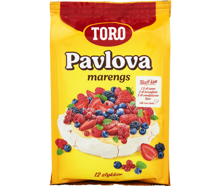 Kan dere gi meg tilbakemelding om Toro Marengs Pavlova inneholder gluten? Vennlig hilsen Celina Anker-Rasch. Faktisk er mer enn halvparten av sortimentet til TORO glutenfritt. Jeg har prøvd pavlovabunnen fra Toro bare en gang, men ble . Server pavlova med vaniljekrem og friske norske bær.